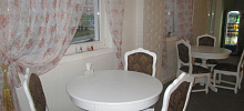 Кафе удивляет количеством белого цвета: стены белые, столы и стулья тоже. Высокие потолки, резная мебель, утонченные лампы в виде подсвечников и легкие тюли – все такое романтичное.