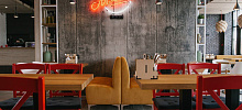 Интерьер заведения задумывался для комфортного отдыха гостей, приближенного к домашнему уюту. Зал оформлен с использованием современных материалов: дерево, кирпича, бетона, металлических конструкций. Потолок украшают необычные светильники-шишки, в интерьере кафе множество деталей, которые хочется рассматривать часами. Так, например, на входе вас встретит итальянский скутер Vespa и стена с открытками, собранными по всему миру. Также в кафе есть специальная банкетная комната, рассчитанная на 12 человек, где вы можете провести семейный или деловой ужин в тихой и уютной обстановке.