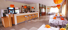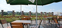 Зал кафе вмещает до 100 человек, в весенне-летнее время работает открытая терраса на 72 человека.